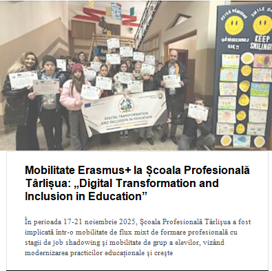 - Erasmus+ Documente Erasmus plus – 18.03.2026 Mobilitate Erasmus+ la Școala Profesională Târlișua: „Digital Transformation and Inclusion in Education” Acreditare Erasmus+ pentru Școala Profesională Târlișua erasmus+